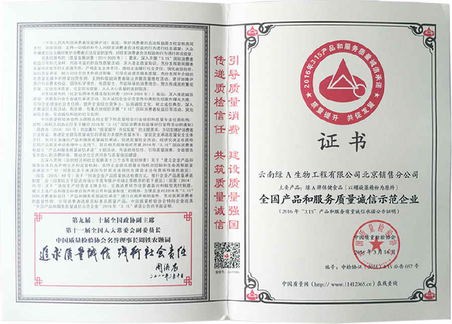 在中国质量检验协举办的2016年3·15国际消费者权益日“产品和服务质量诚信承诺”活动中,绿A一举获得“全国产品和服务质量诚信示范企业”荣誉称号!这已经是绿A第三次获此殊荣了,这是国家及社会对绿A品牌的高度认可及重视。《中国质量报》、《中国消费者报》等多家媒体均报道了这一喜讯。
