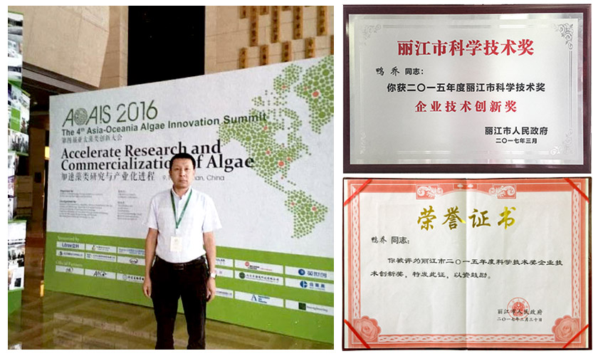 此次荣获“企业技术创新奖”的绿A园鸭乔副总经理,是云南省丽江市永胜县人,自1993年参加工作至今,一直从事程海螺旋藻等云南特色生物资源的产业化应用研究开发及相关科技项目的管理实施工作 。先后组织实施了“红球藻产业化养殖和生产、螺旋藻儿童型保健食品的研发、虾青素油提取关键技术及产品开发、螺旋藻养殖废水净化工艺研究及产业化应用、绿A天然螺旋藻精片深加工工艺技改、红球藻产业化工艺创新及产品标准制定、红球藻CQ2超临界萃取虾青素技术开发”等包括“863”计划项目的国家及省市级科技项目。