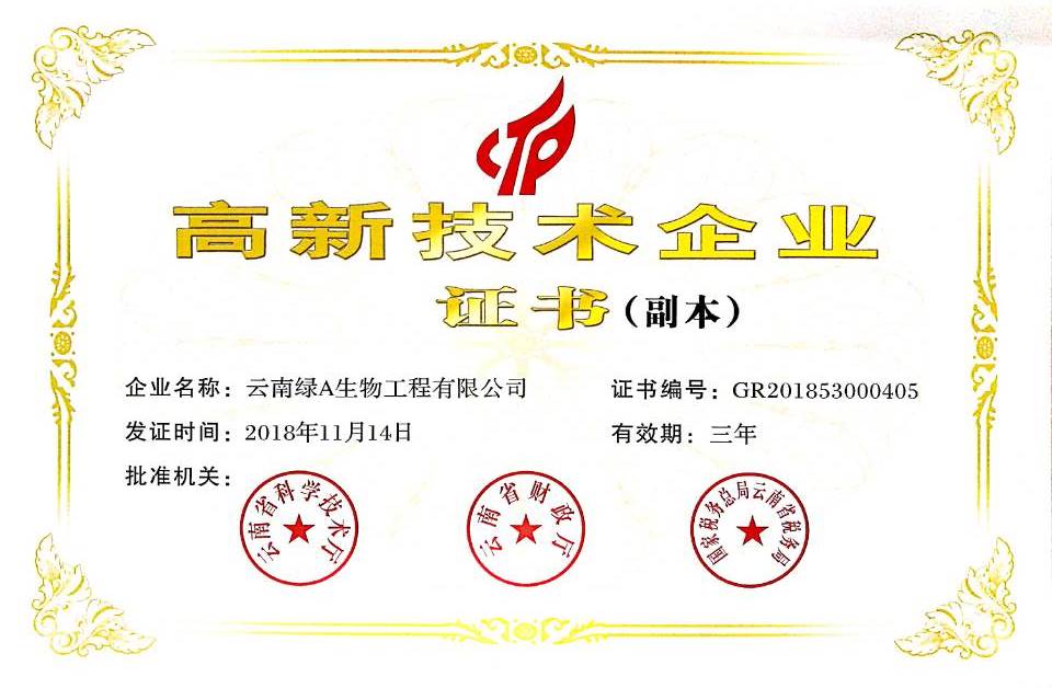 1月10日,绿A再次收到 “高新技术企业”证书,证书编号:GR201853000405, 该证书由云南省科学技术厅、云南省财政厅、国家税务总局云南省税务局联合颁发,证书有效期三年。高新技术企业门槛较高,认定须经过严格的测评和审批程序,绿A凭借过硬的技术实力再次荣获高新技术企业,这标志着公司在研发和创新方面得到国家相关部门的肯定与认可。