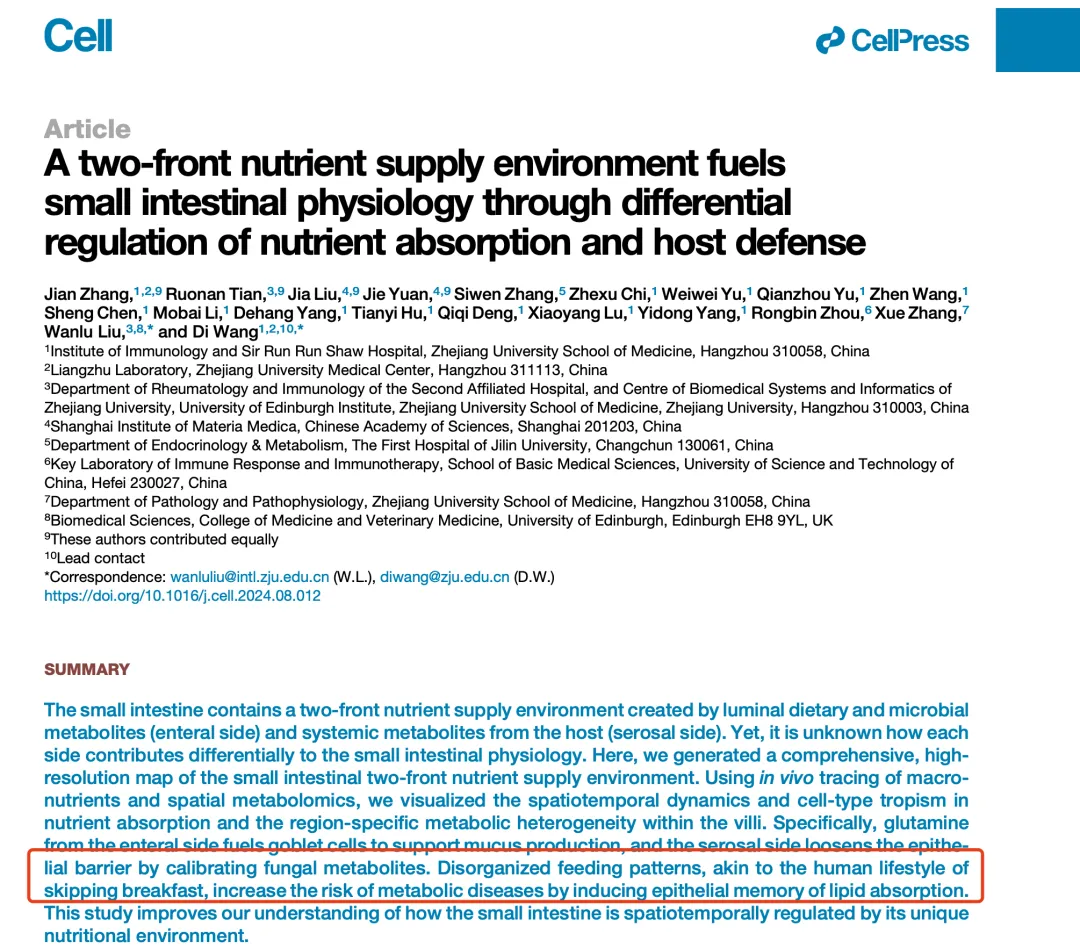 日前,浙江大学医学院附属邵逸夫医院、浙江大学爱丁堡大学联合学院、中国科学院上海药物研究所的研究团队,在顶尖学术期刊《细胞》(Cell)上合作发表一篇论文表明,不吃早餐的这种饮食习惯会改变小肠对营养物质的吸收方式,从而会增加代谢性疾病的风险。