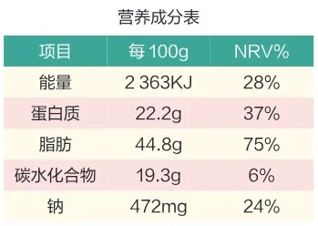表中最右列NRV%为该产品中各营养素的含量占其营养素参考值的百分比。由于消费者很难从数字表面看出食品中某一种营养素的高低,而如果以百分含量来表示,则很好理解。比如:上述坚果中的脂肪含量为44.8g,占脂肪NRV的75%,意思就是如果吃100g这个产品,大概能够满足一般成人一天所需脂肪的75%,所以再吃其他含脂肪多的食物就要适当控制了(当然每个人的身高、体重、体力活动水平等并不完全一样,需求量可能也有差异)。