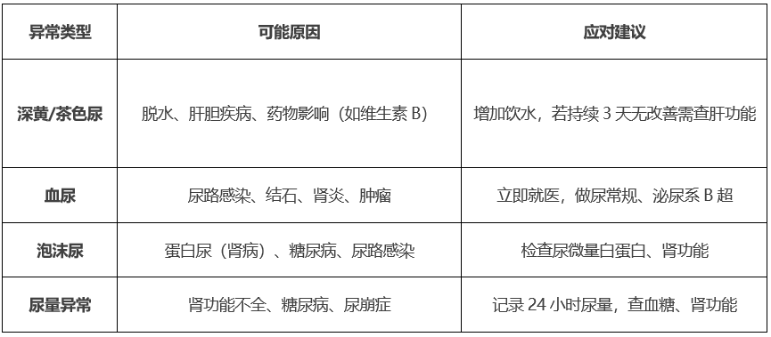 持续深黄色尿+口渴乏力:提示脱水或糖尿病、肝功能异常。